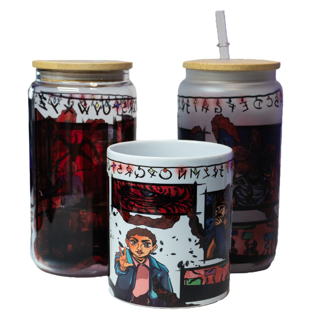 Bicchiere da collezione decorato con un’illustrazione originale fan art realizzata da LeezyArt. Un design artistico dallo stile rétro e atmosferico, perfetto per chi ama estetiche anni ’80, tonalità misteriose e dettagli ricercati.