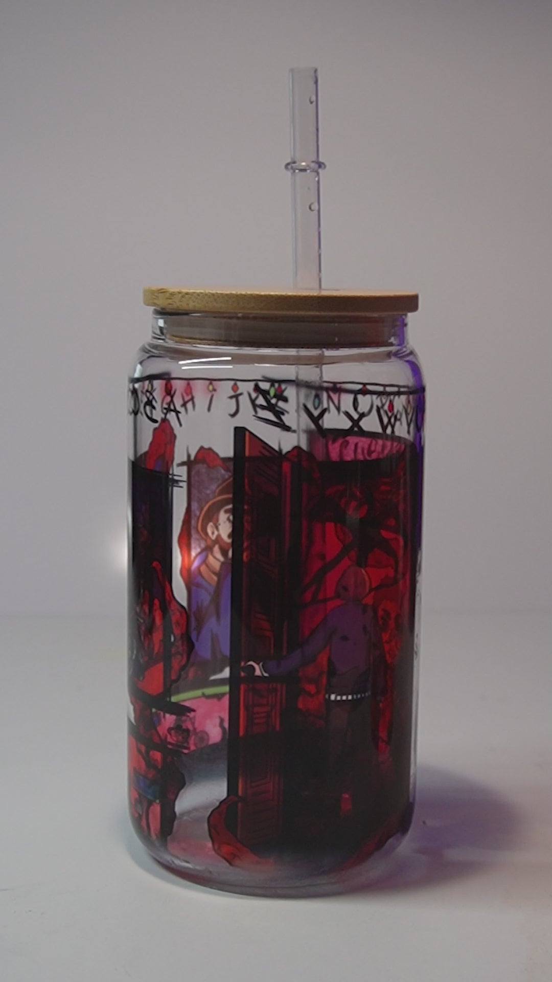 Bicchiere da collezione decorato con un’illustrazione originale fan art realizzata da LeezyArt. Un design artistico dallo stile rétro e atmosferico, perfetto per chi ama estetiche anni ’80, tonalità misteriose e dettagli ricercati. Opera non affiliata né associata a franchise o produzioni ufficiali.